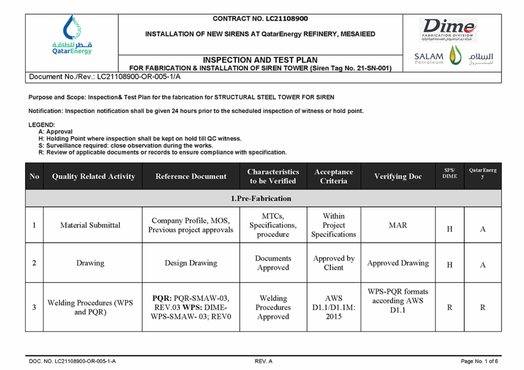 SOW: FABRICATION AND INSTALLATION OF THE SIREN TOWERPROJECT: QATAR ENERGY RIFENERY, MESAIEED